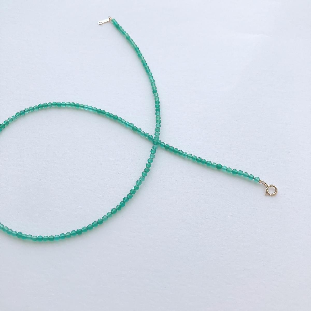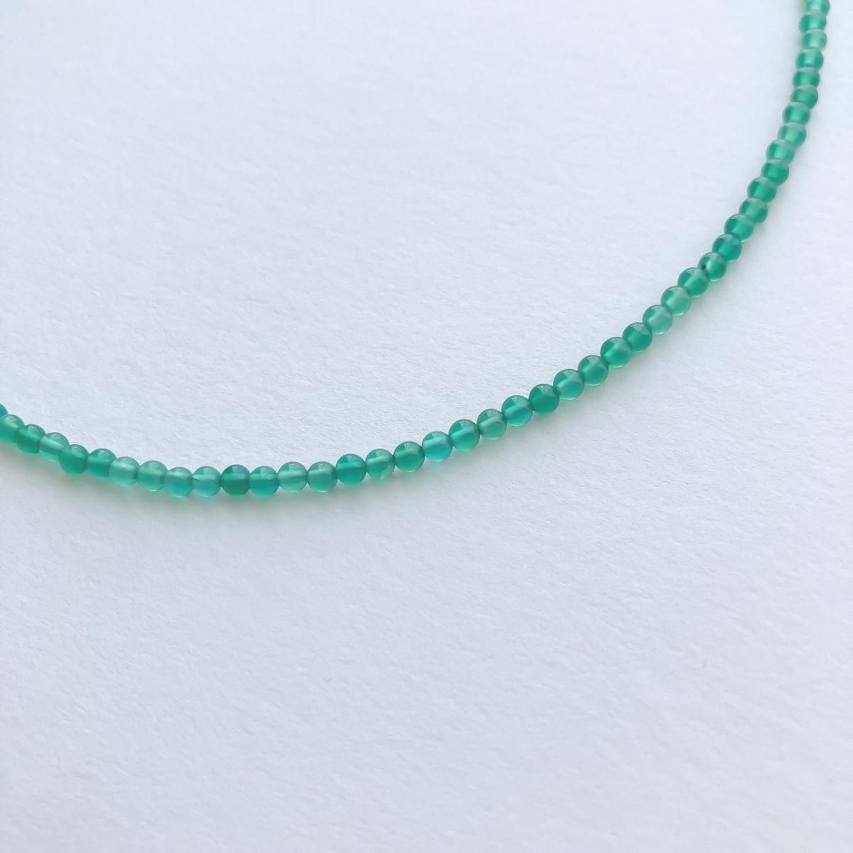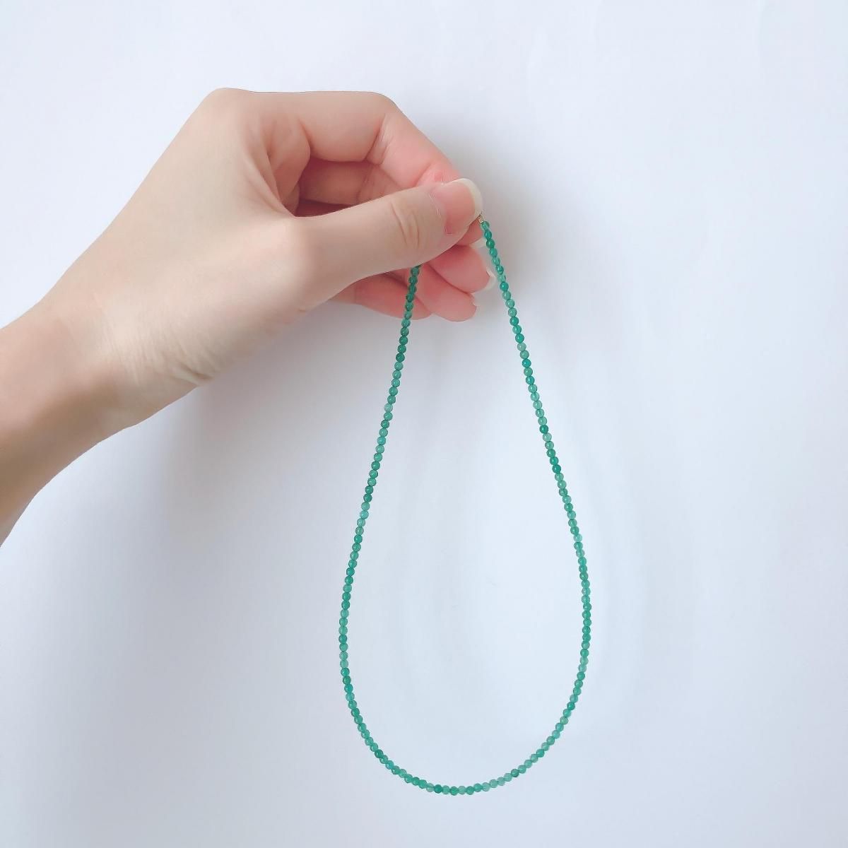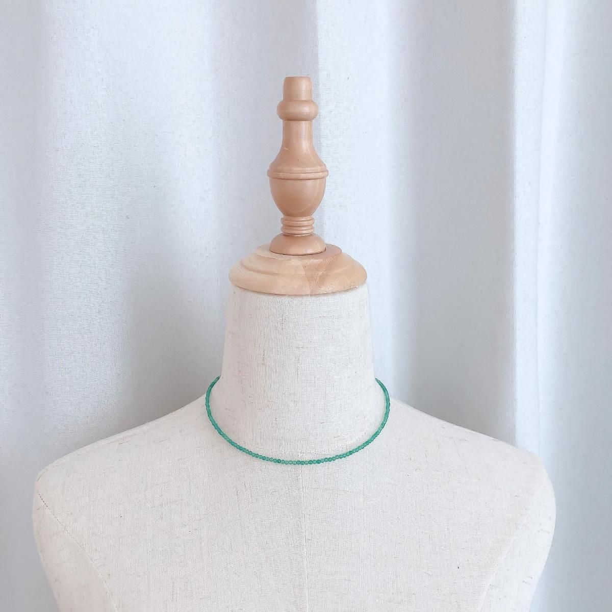 極小のラウンド型の天然石を、程良い張り感が特徴的なナイロンコーティングのステンレスワイヤーに通したシンプルなネックレスです。