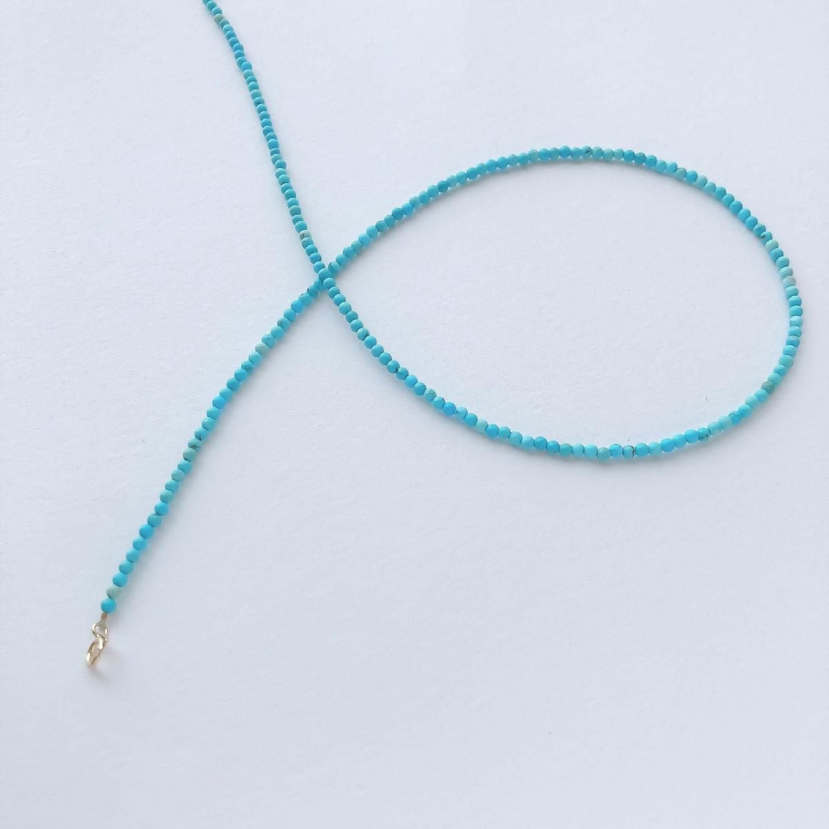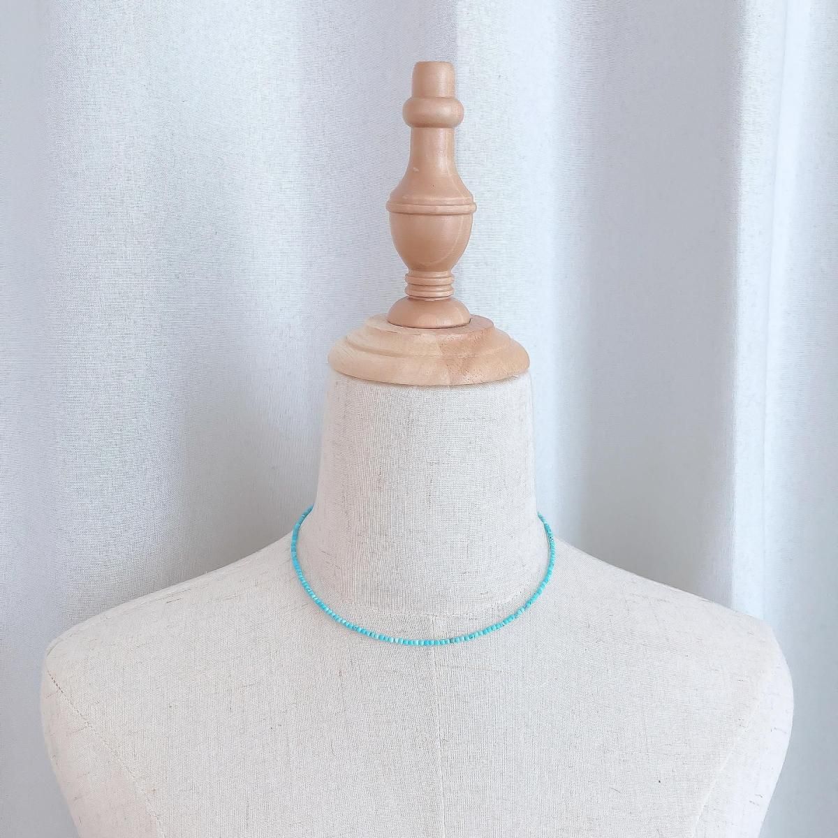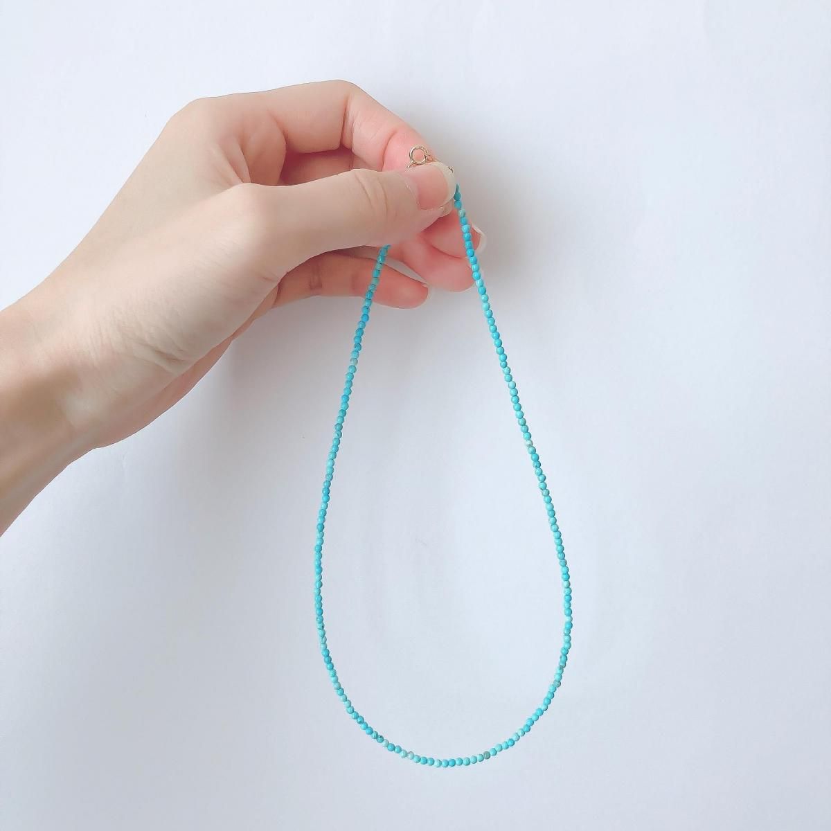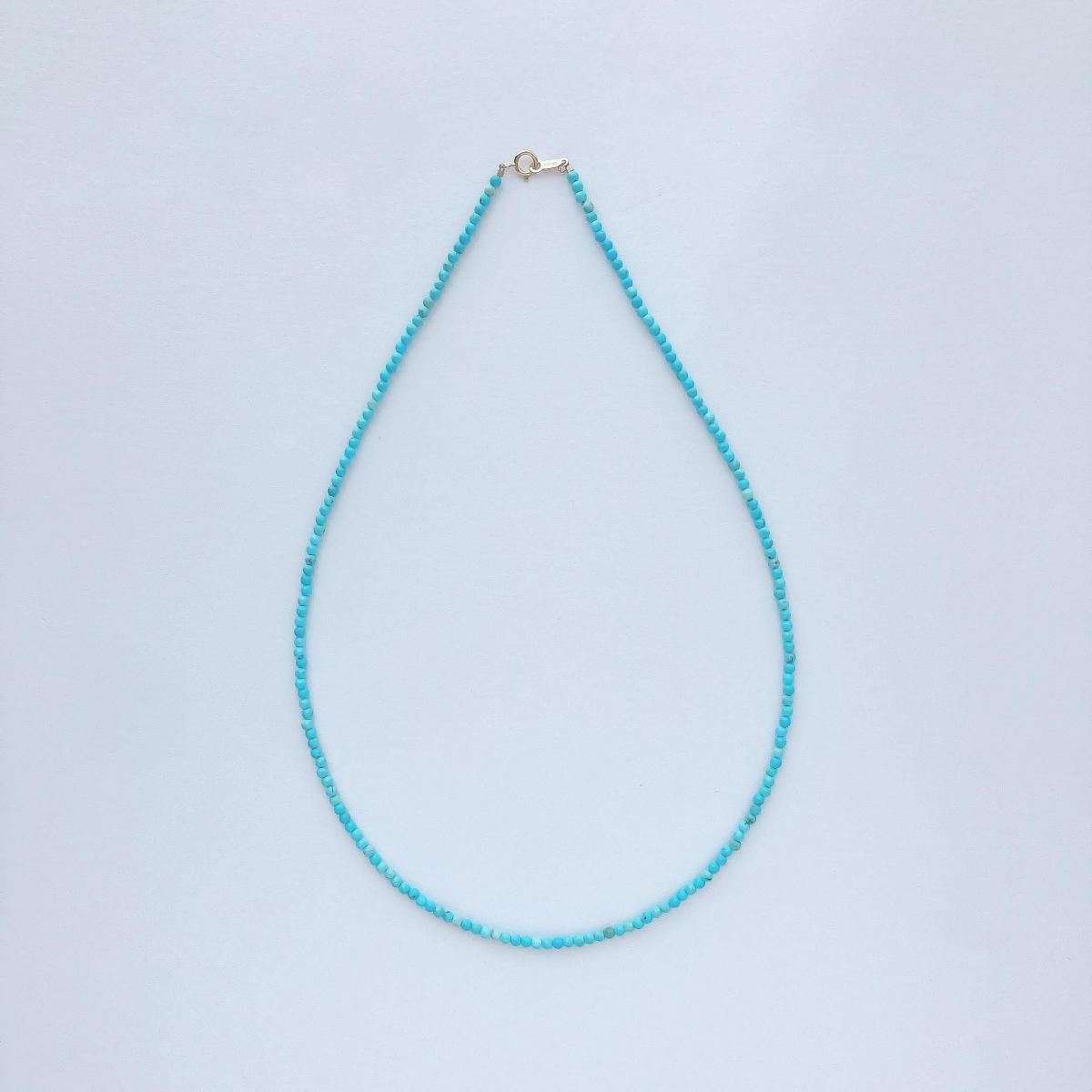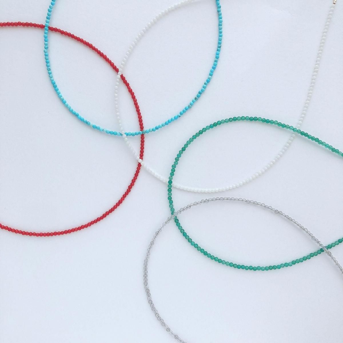 極小のラウンド型の天然石を、程良い張り感が特徴的なナイロンコーティングのステンレスワイヤーに通したシンプルなネックレスです。