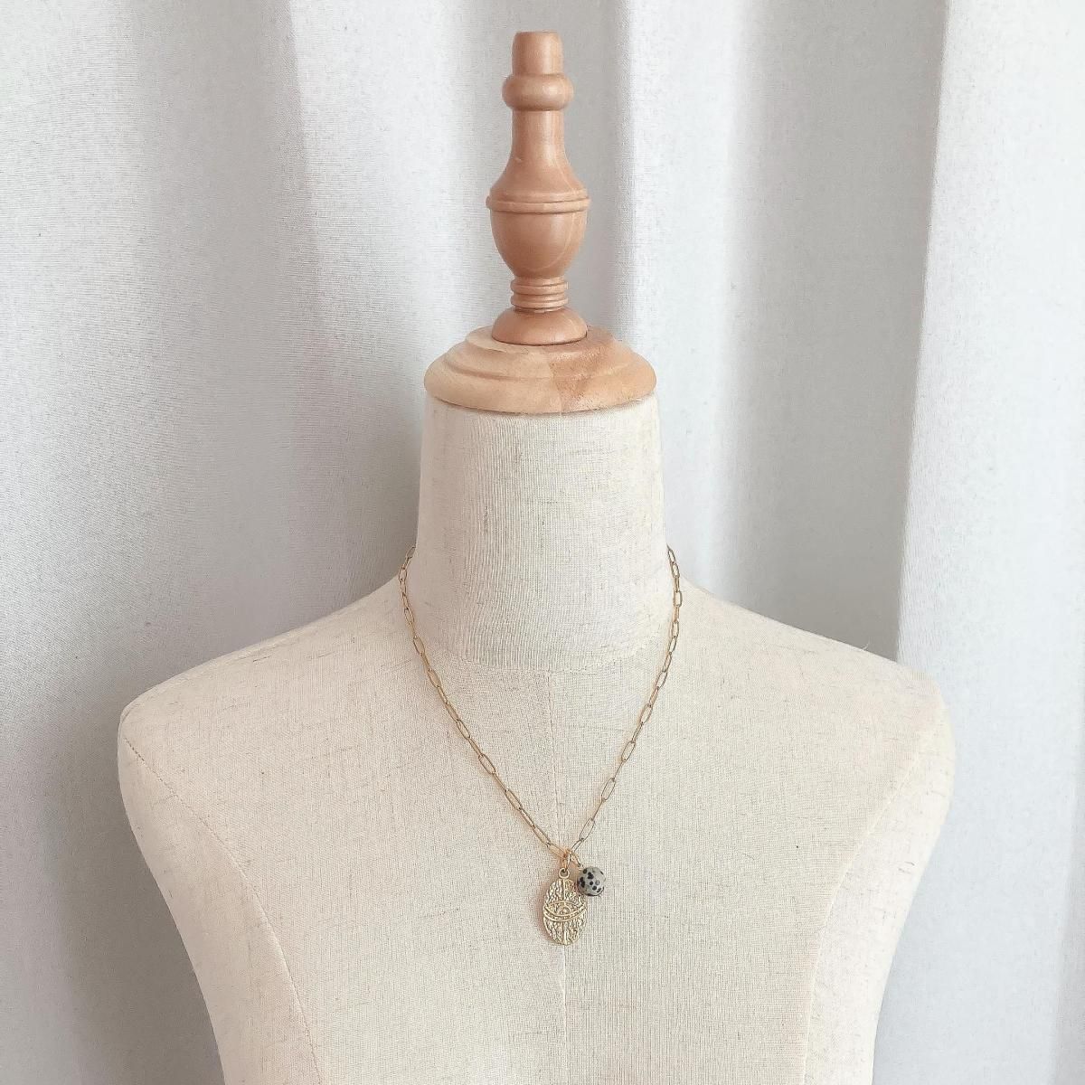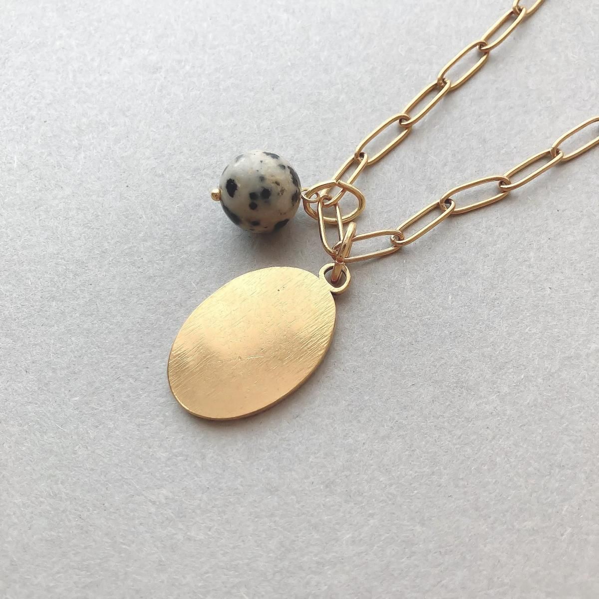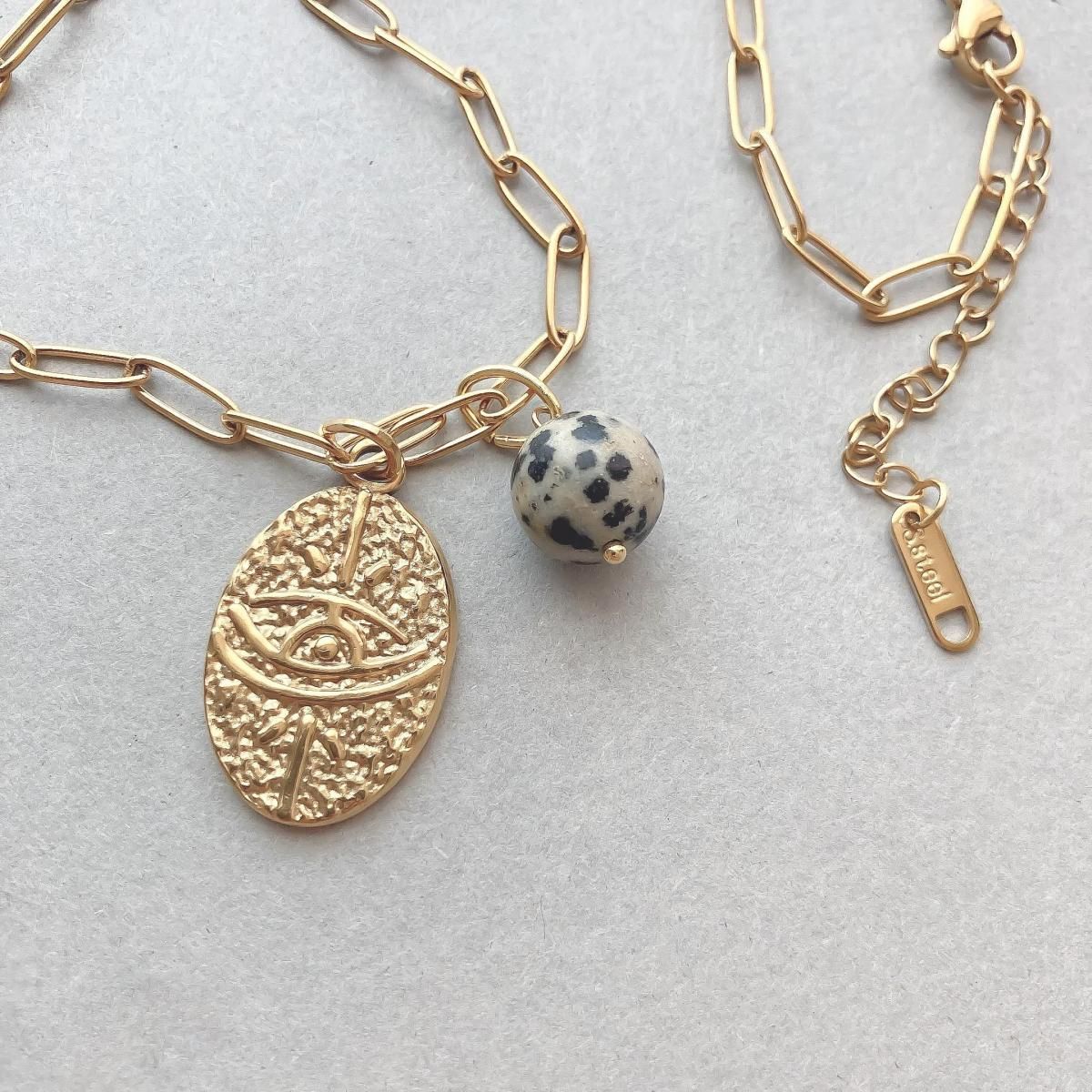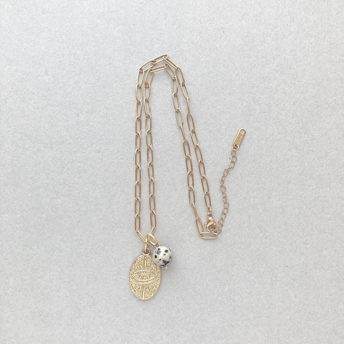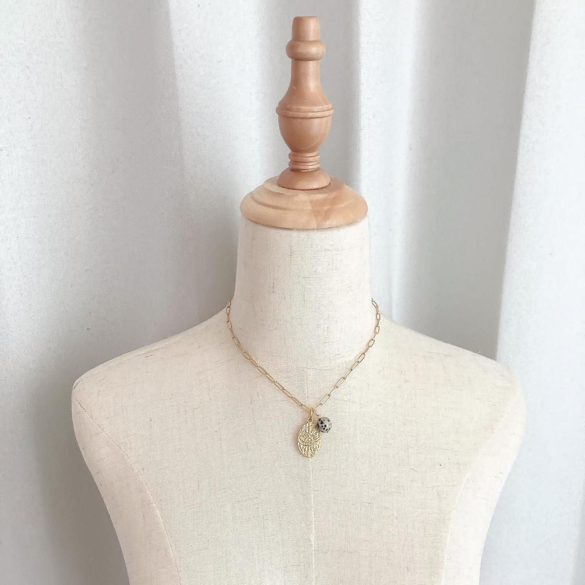 アイモチーフがプレスされたオーバル型のメタルコインに、ダルメシアンジャスパーのラウンドボールを下げたネックレスです。