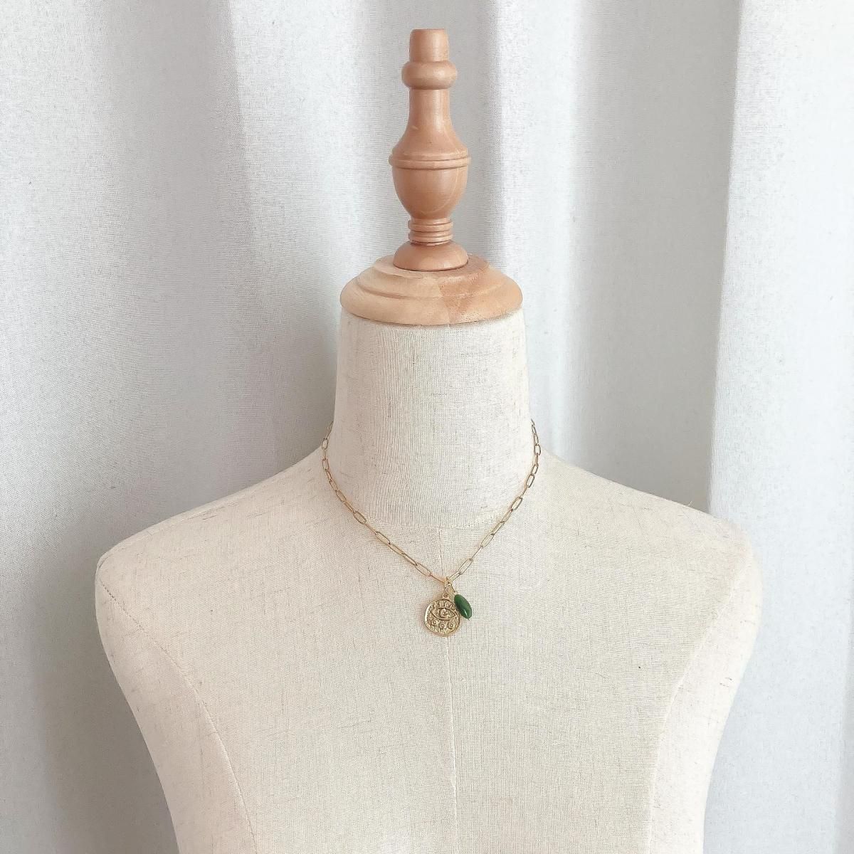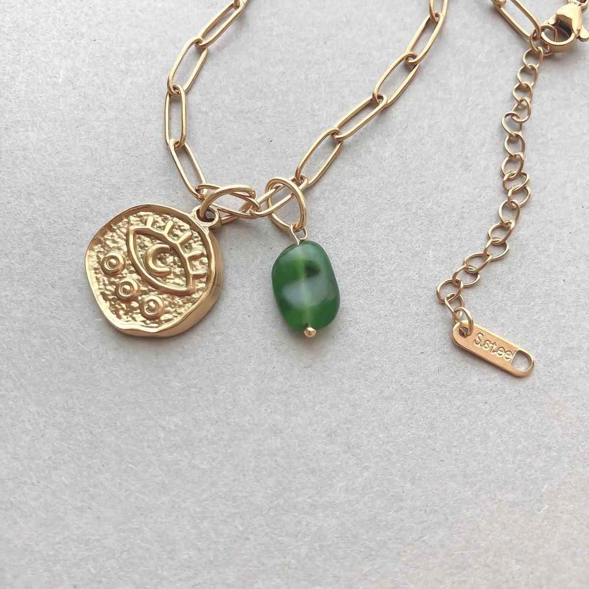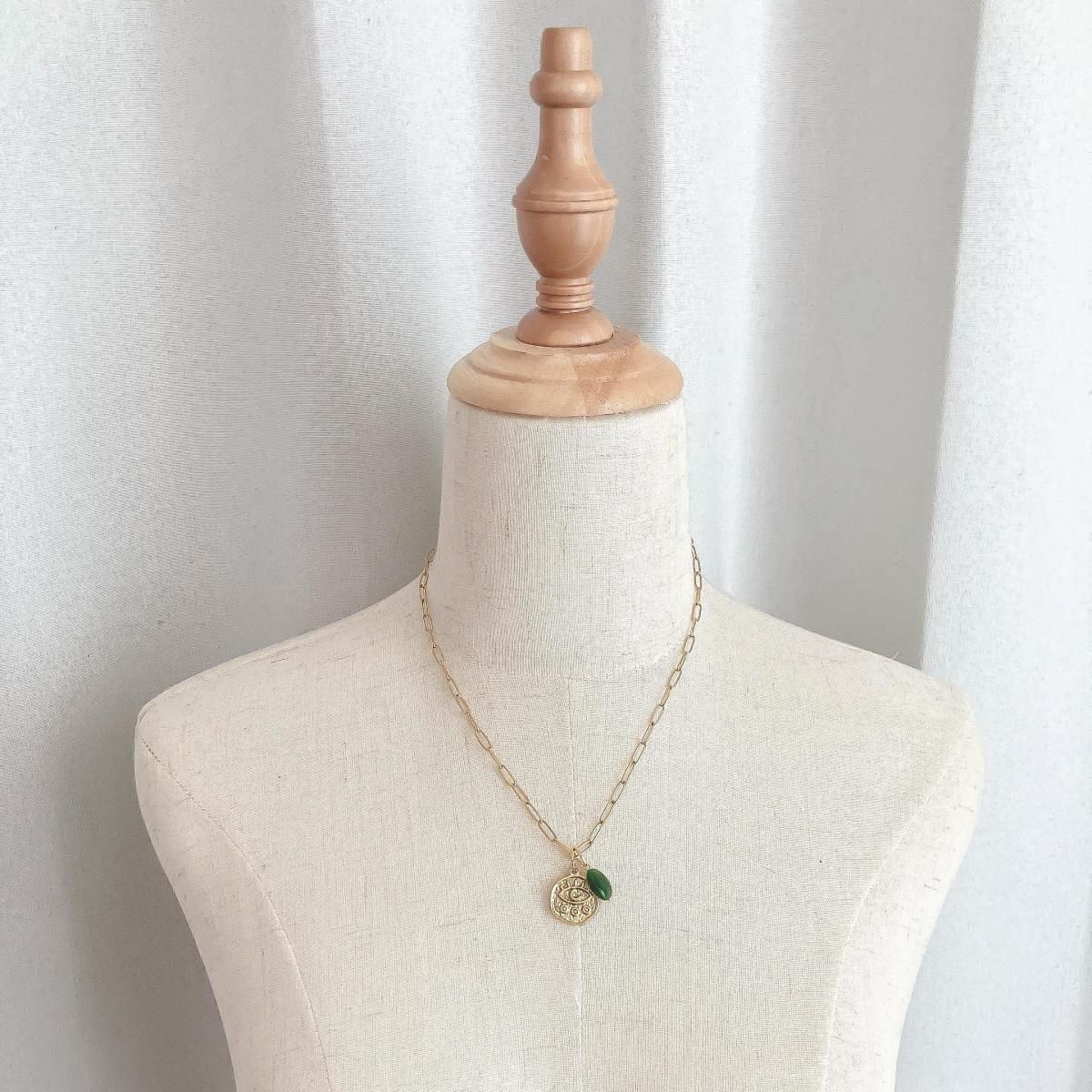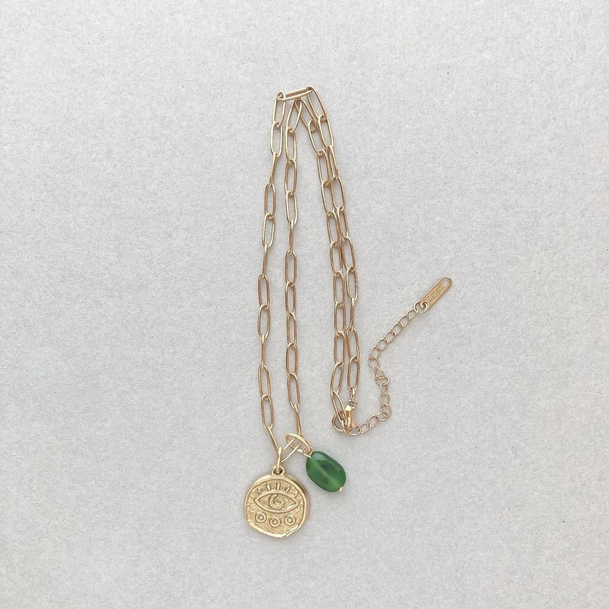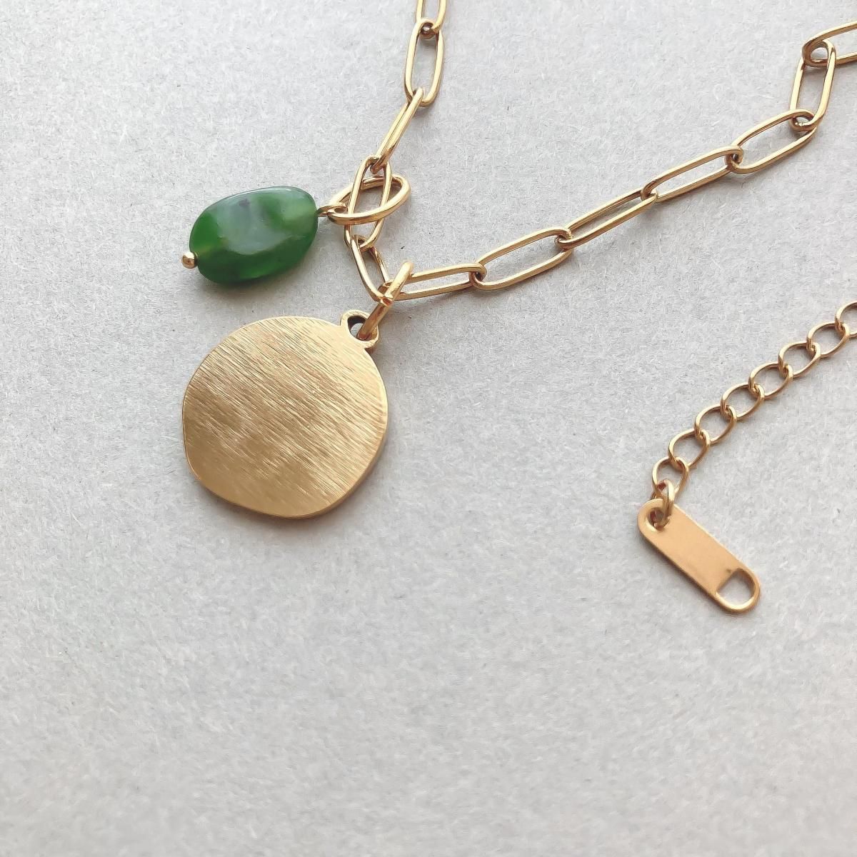 アイモチーフがプレスされたメタルコインに、ネフライトの石を下げたネックレスです。